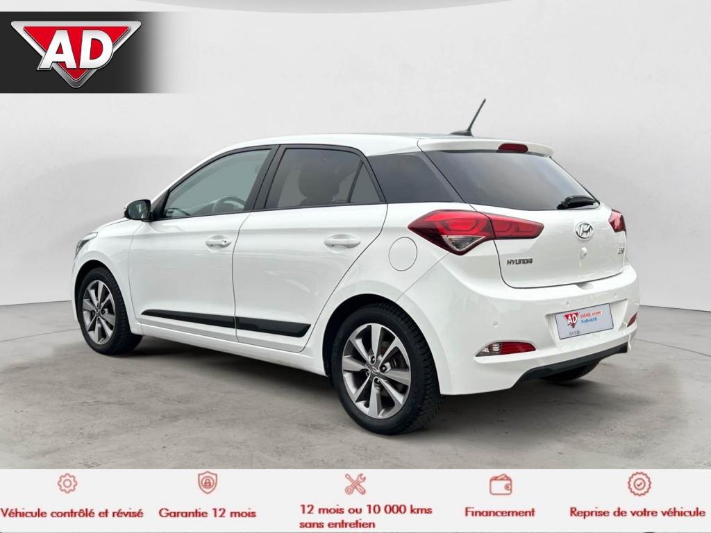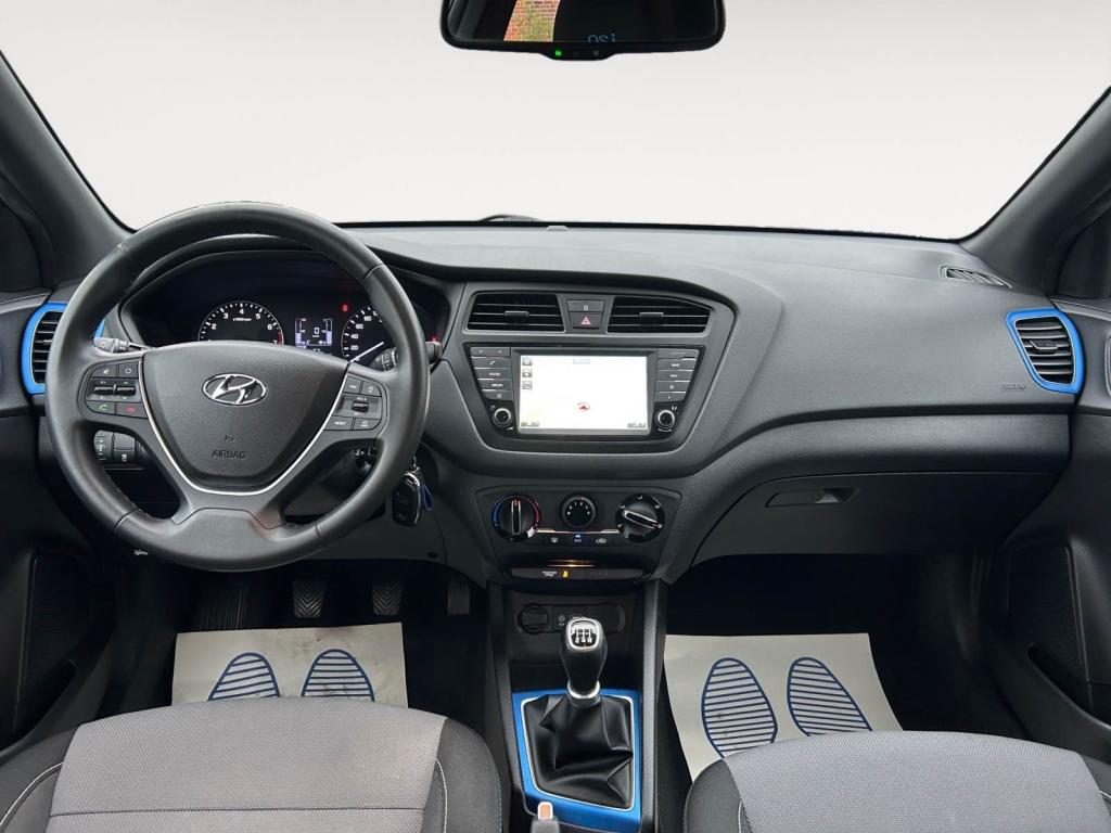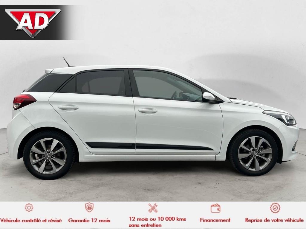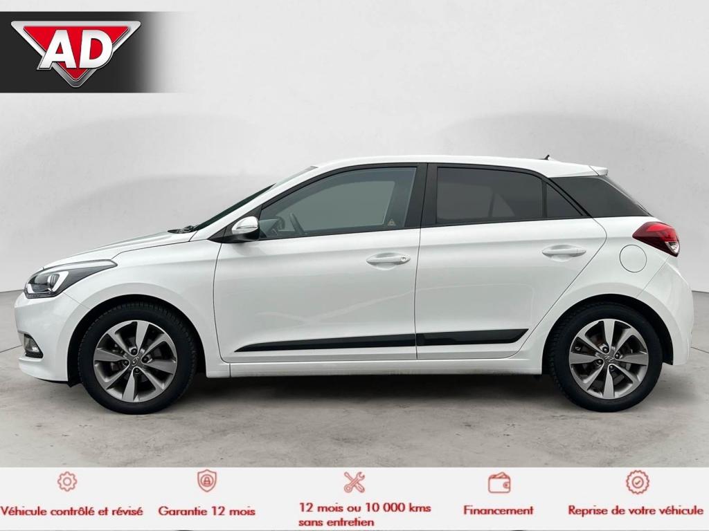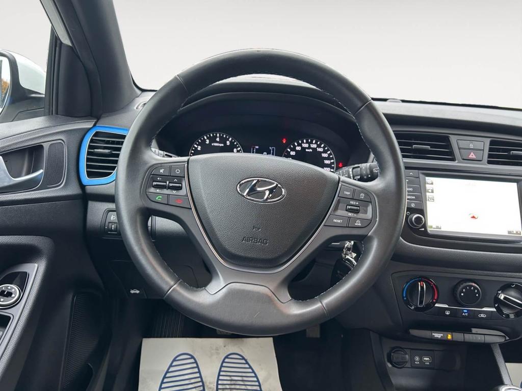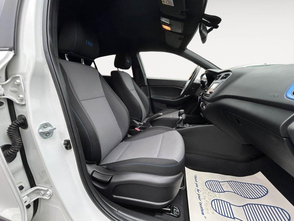 Aide au démarrage en côteAide au stationnement arrièreAirbags frontaux conducteur et passager (déconnectable côté passager)Airbags latéraux avantAirbags rideaux avant et arrièreAlerte de non-bouclage de la ceinture de sécurité à toutes les placesAllumage automatique des projecteursAntidémarrageAppuie-tête avant et arrière règlables en hauteurBacs de portières AV & ARBanquette arrière rabattable 40/60Boîte à gants ventiléeBroderie "i20" sur les appuie-têtes avantCapteur de pluieCeintures de sécurité avant et arrière à prétensionneurCiel de toit noirClimatisation manuelleCommandes au volantConnexion BluetoothContrôle de la pression des pneumatiquesContrôle de trajectoire électronique (ESP & VSM)Décors interieurs noirsDirection assistée électriqueEclairage d'accueil et d'accompagnementEssuie-glace arrière avec déclenchement automatique en marche arrièreFeux de jour et feux de position à LED et éclairage additionnel en virageFilet de coffreInserts bleus (buses d'aération et contour du levier de vitesses)Jantes alliage 16''Kit de réparation anti-crevaisonLampes de lecture avantMiroirs de courtoisie éclairés conducteur et passagerMontant arrière noir laquéMoulures de protection latéralesOrdinateur de bordPlancher de coffre modulablePoignées de portes couleur carrosseriePoignées de portes intérieures grain métalPorte-gobelets avantProjecteurs antibrouillardRange-lunettesRégulateur et limiteur de vitesseRépétiteurs de clignotants intégrés aux rétroviseurs extérieursRétroviseur intérieur électrochromeRétroviseurs extérieurs couleur carrosserieRétroviseurs extérieurs électriques et dégivrantsSécurité enfants sur portes arrièreSiège conducteur réglable en hauteurSignal de freinage d'urgence par feux de détresseSurpiqures bleues et blanches sur le volant, les sièges et le soufflet de levier de vitessesSystème antiblocage des roues ABSSystème audio RDS compatible MP3, prise auxiliaire et connexion USBSystème Isofix aux places latérales ARSystème multimédia avec Navigation EuropeVerrouillage automatique des portes en roulantVerrouillage centralisé à distance avec clé rétractableVitre conducteur à commande séquentielleVitres arrière électriquesVitres arrière et lunette arrière surteintéesVitres avant électriquesVitres teintéesVolant et levier de vitesses gainés cuirVolant réglable en hauteur et en profondeur